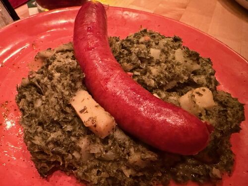 これもドイツのクリスマス料理の1つだそうです。別にクリスマスだけというわけではないと思いますがが、特にクリスマス時期に好んで食べられるものだそうです。 多分、この色合いがクリスマスっぽいのでしょう。小さく切ったケールと茹でたポテト、それとザ…